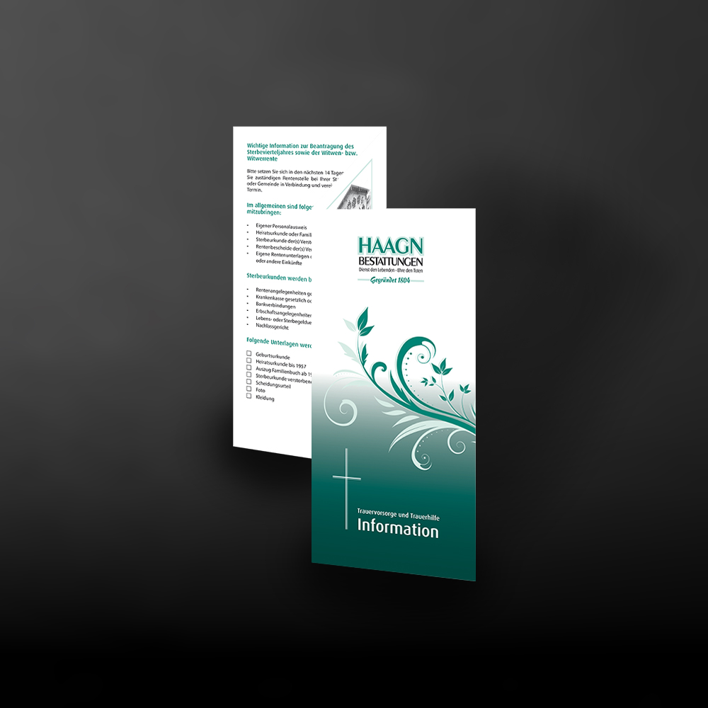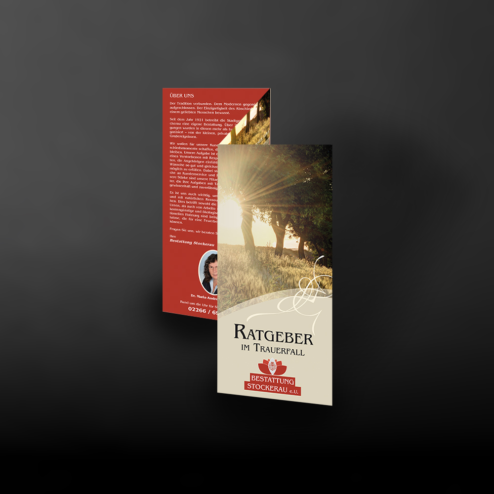 Gestalten Sie mit uns einen individuellen Folder mit wichtigen Informationen zu Ihren Leistungen oder für Werbezwecke. Mit einem Faltblatt können Sie gewünschte Infos leicht und schnell präsentieren. Wir beraten Sie gerne, welche Möglichkeiten vom Format, Papier und Falzung am Besten für Sie passt.
