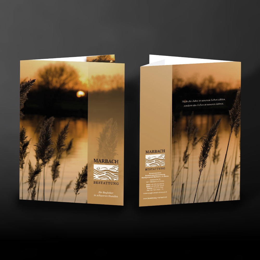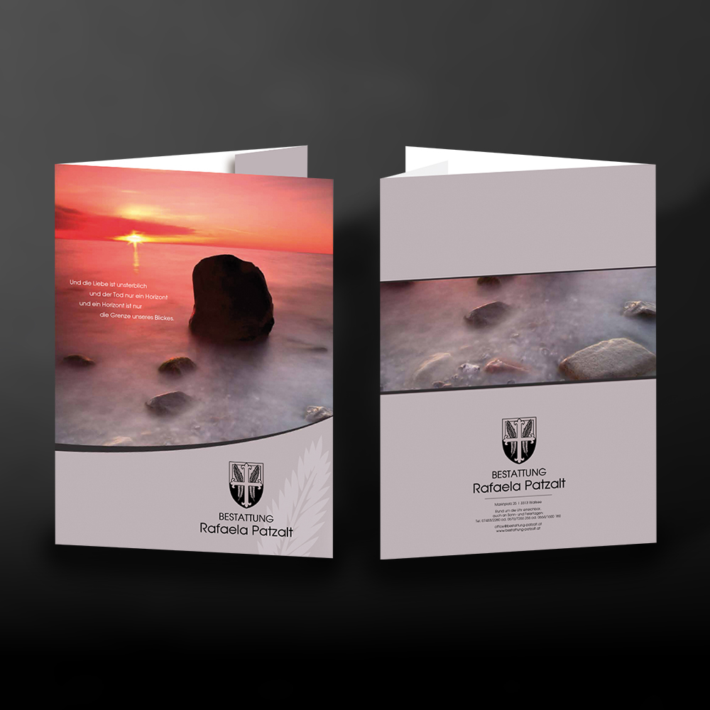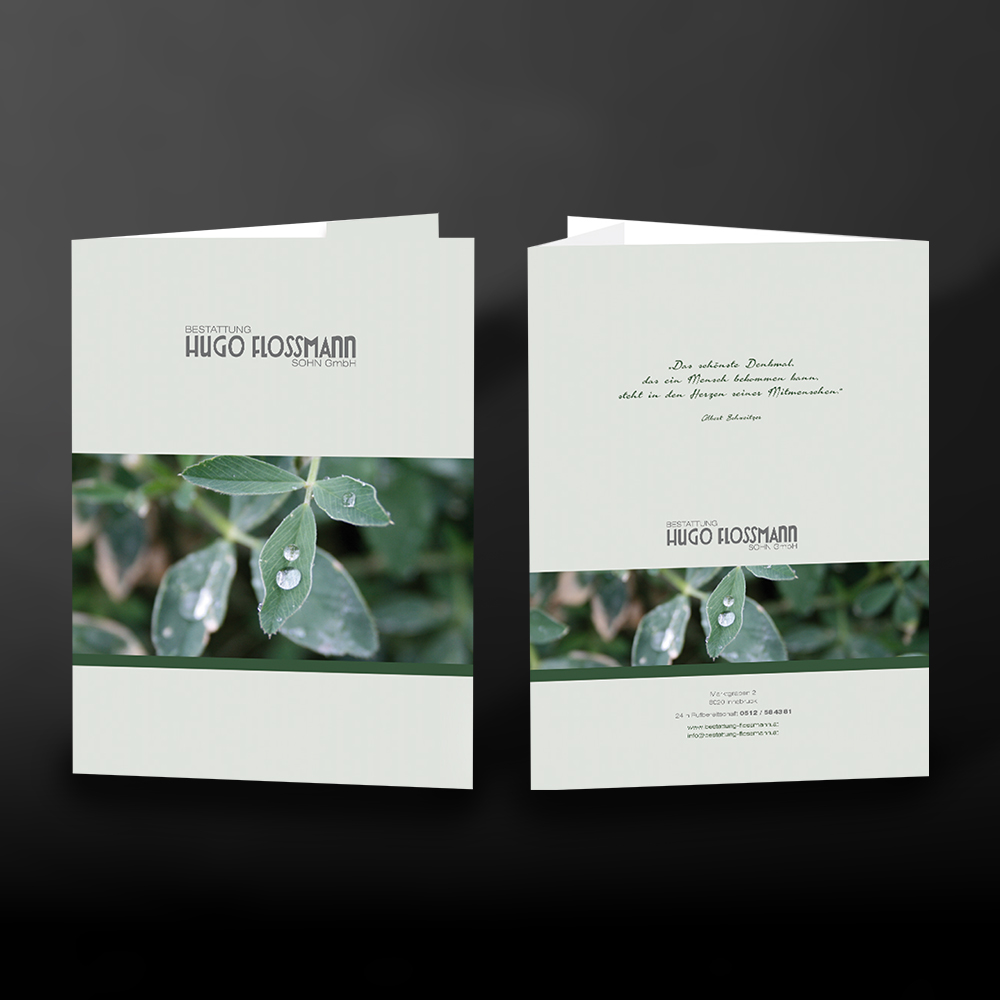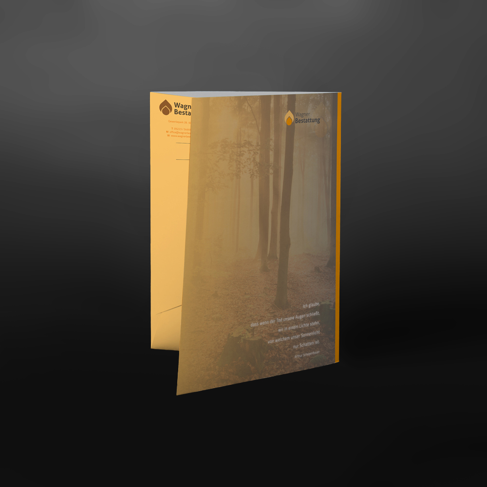 Lassen Sie sich eine schöne Flügelmappe individuell für Ihre Bestattung gestalten mit Ihrem Wunschmotiv. In die Mappe können Dokumente, Parten und weiteres Papier bis zum Format A4, sowie Klarsichthüllen eingelegt werden. Die seriöse Schreibmappe ist ideal zum Beispiel bei einem Beratungsgespräch oder einer professionellen Bestattungsvorsorge. Doch gleichzeitig transportiert die Mappe neben den Unterlagen auch Ihre Werbebotschaft - durch Ihren Firmenlook mit Logo, Werbeslogan und anderem mehr. Mit dem praktischen Abheftstreifen kann die Mappe auch in Ringordnern abgeheftet werden. Neben vielen weiteren Möglichkeiten gibt es auch einen Kugelschreiberschlitz an der Seitenlasche - den passenden Kugelschreiber gestalten wir Ihnen gerne ebenfalls.