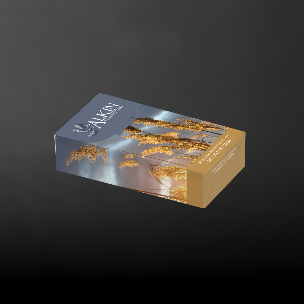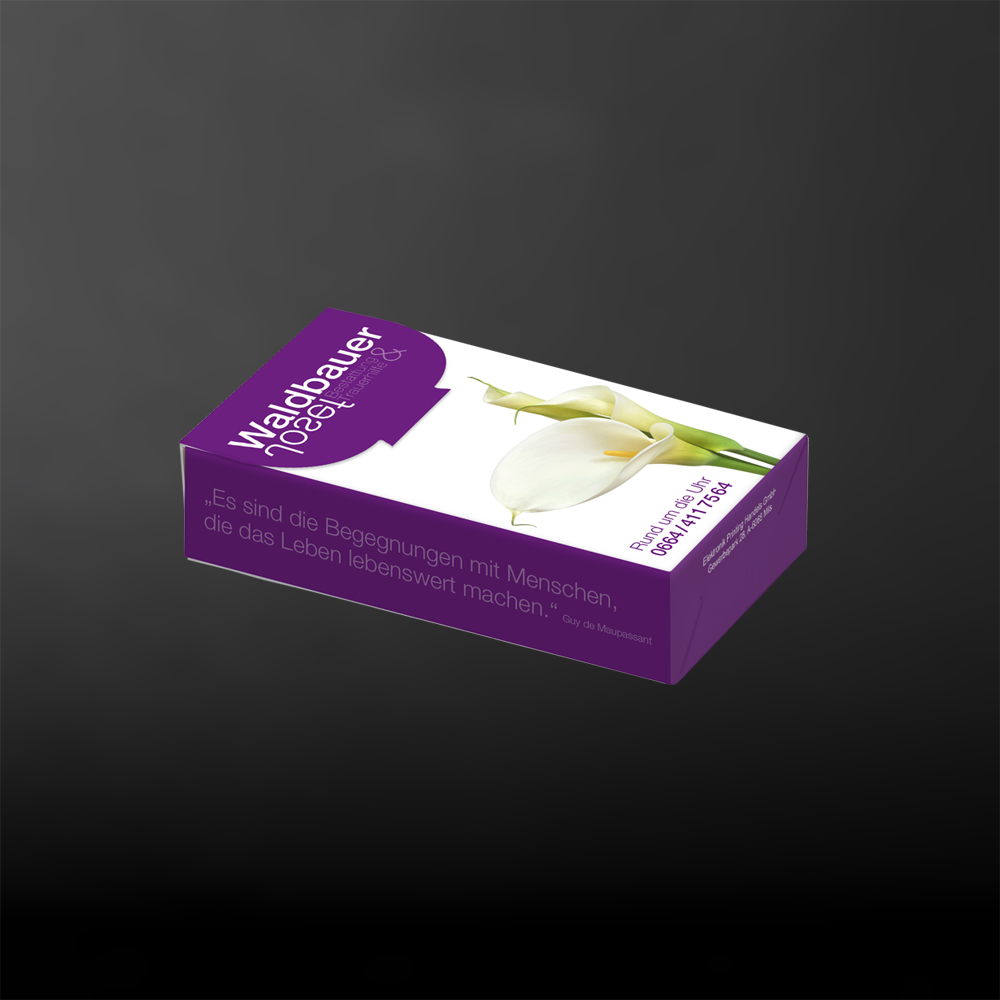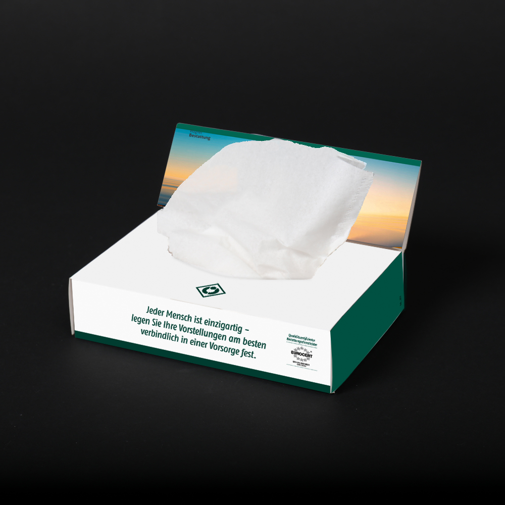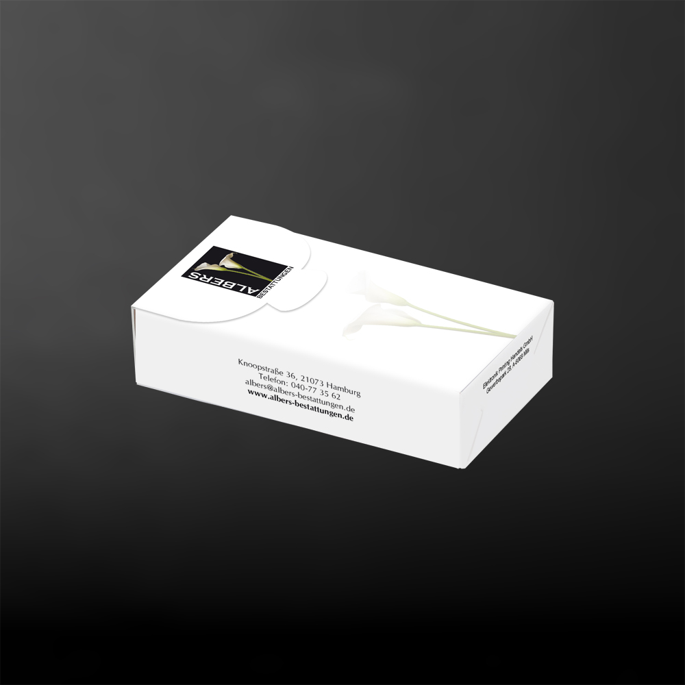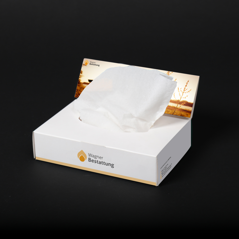 Ein praktischer und bei Trauer häufig verwendeter Artikel ist das Papiertaschentuch. Lassen Sie doch Taschentücherboxen mit Ihrem Logo bedrucken, die Sie dann an Angehörige verteilen können. Unsere Grafiker gestalten die rundum bedruckten Boxen mit Lasche gerne für Sie in Ihrem Corporate Design. Die Lieferung umfasst 10 Taschentücher pro Schachtel. Lassen Sie sich auch zu größeren, personalisierten Papier-Taschentücher Boxen von uns beraten.