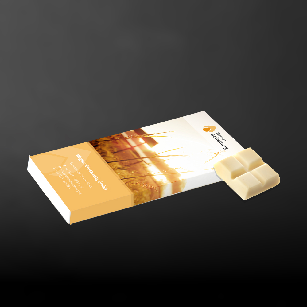 Wer liebt Schokolade nicht? Mit gestalteter Verpackung eignen sich Schokoladentafeln wunderbar als kleine Werbegeschenke mit leckerem Inhalt. Die Werbekartonage lässt sich individuell nach Ihren Vorstellungen vierfärbig bedrucken. So wird Ihr Kunde vor dem Verzehr noch einmal daran erinnert, von wem der süße Gruß kommt - schließlich genießt das Auge mit.